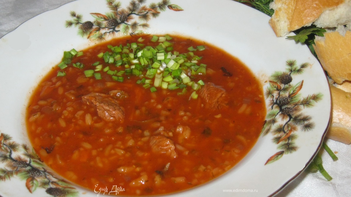 - Шаг 1В двух литрах подсоленной воды я поставил вариться говяжью косточку, добавил половинку луковки, морковку и букетик специй (итальянцы называют его букет Гарнии). По паре веточек укропа, петрушки, базилика, розмарина и три листика лаврушки перевязанные ниткой. После того как снял пену, добавил пол дюжины горошин перца. Через полчаса положил говяжий гуляш и оставил вариться на среднем огне под крышкой еще на час. Готовый бульон процедил, поставил на плиту и добавил уже мягкий гуляш. Не смотря на то, что бульон варился пол крышкой, выкипело достаточно много и осталось меньше полутора литров. Рис нужно брать круглый, но у меня был только длиннозерный, я взял его. Три столовых ложки риса промыл холодной водой и положил в кипящий бульон. Пока рис варился, порубил полторы луковицы репчатого лука и мелко нарезал крупный помидор, очистив его от шкурки. Лук спассировал в четырех столовых ложках растительного масла, добавил помидор, а поскольку помидор зимний, то есть водянистый и не ароматный, добавил еще две столовых ложки густой томатной пасты. Морковь в харчо не кладут, но я решил не оставлять вареную морковку из бульона и добавил ее, натерев на крупной терке. Развел половником душистого бульона из кастрюли, получилась вкусная и ароматная заправка, которую я переложил в кастрюлю, когда рис наполовину сварился. Осталось самое главное. Пять крупных зубчиков чеснока размолол в блендере со щепоткой крупной соли. Потом добавил к нему по три веточки петрушки, укропа, базилика, листики с двух веточек розмарина, по чайной ложке майорана, шафрана и чабреца (зимой, к сожалению, не все травы можно купить в свежем виде) и пол чайной ложки порошка чили. Буйный аромат пряных трав, возбуждает сильный аппетит! Ну да еще недолго осталось. Рис тем временем уже почти сварился. Добавил в суп смесь трав, перемешал и оставил постоять под крышкой пять минут, выключив огонь. Я не очень люблю сильно острую пищу, но в свою тарелочку харчо положил еще пару щепоток чили. Суп получился густой, горячий, обжигающий остротой и душистый. Лаваш я тоже не купил, но думаю, мягкий белый хлебушек с хрустящей корочкой его неплохо заменит. Можно было добавить еще молотый грецкий орех. Я как то пробовал, но мне не очень понравилось. Ну да это дело вкуса. Попробуйте.