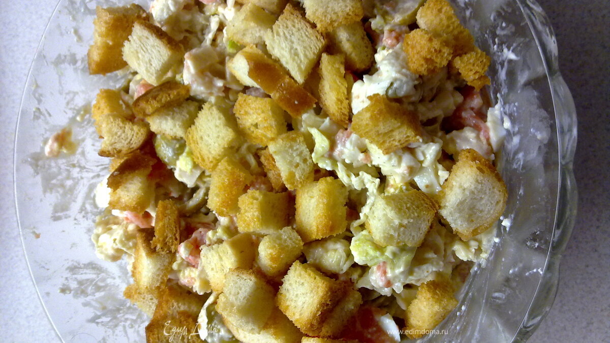 - ПодготовкаКреветки отварить в подсоленной воде(можно с лимоном), очистить. Рыбу, крабовое мясо и яйца нарезать небольшими квадратиками. Оливки режем пополам. Пармезан натираем на мелкую терку.Китайскую капусту рвем на небольшие кусочки и все вышеперечисленные ингридиенты выкладываем в салатник, сбрызгиваем лимонным соком и бальзамическим уксусом.Заправляем майонезом. Сухарики можно использовать покупные (только из белого хлеба) или сделать самим: с батона срезаем корочки,мякиш режем на квадратики, сбрызгиваем оливковым маслом и отправляем в духовку до появления золотистой корочки.Выкладываем их поверх салата, чтобы они не намокли.