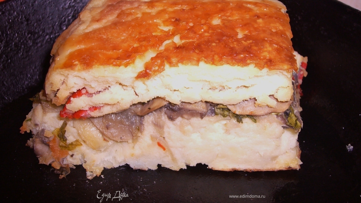 В прямоугольную форму,смазанную маслом,выложи пергамент,затем половину пюре смешанное со взбитыми яицами,затем грибы с зеленью и перец и остальное картофельное пюре.Поместить в разогретую духовку до 180 г и печь около 40 мин.Как появиться румянец:)Когда переварачиваете на блюдо,можно посыпать сверху сыром.Приятного аппетита!