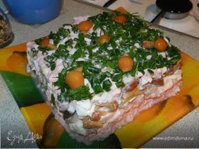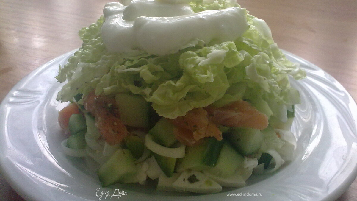 - Шаг 1Переворачиваем чашку с салатом на тарелку. Сверху добавляем заправку и можно немного посолить, хотя сёмга и без того солёная. Приятного аппетита!=)