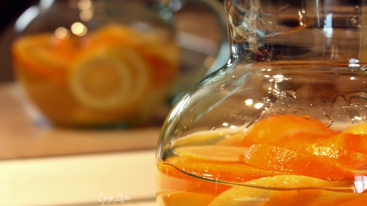 - Шаг 1Нарезаем в кастрюлю кружками лимон и апельсин,засыпаем сахаром и оставляем на 5 минут.Ставим на плиту и слегка прогреваем, пока не раствориться полностью сахар.Оставляем на 1-2 часа и добавляем прохладной воды 1 литр.Лимонад готов!Я не очень люблю терпковатый привкус апельсиновых корочек, поэтому через 15-20 минут убираю фрукты из графина.