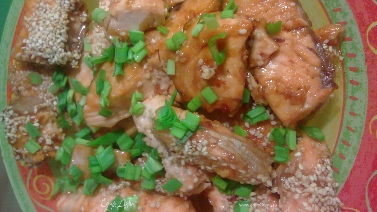 Порезать лосось на кусочки и обжарить на оливковом масле. На сухую сковородку налить соус терияки и переложить на нее рыбку, сверху также залить соусом и посыпать кунжутом. Подержать под крышкой на слабом огне 5 минут.