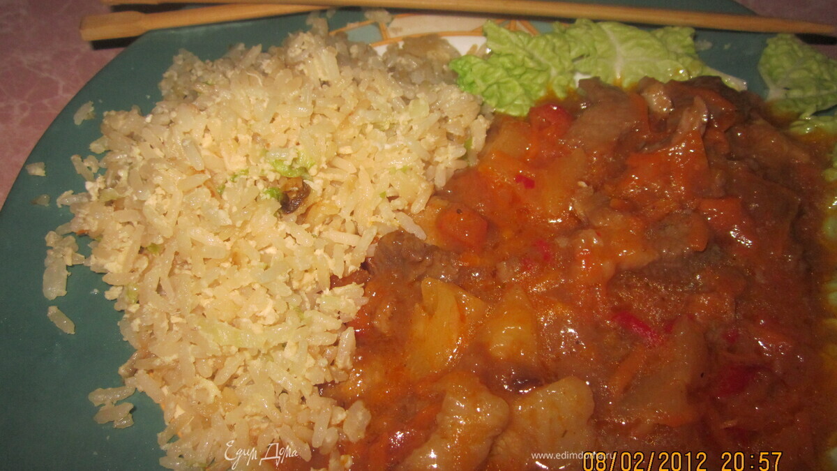 Всыпаем рис.Жарим минут 15.Нальем несколько столовых ложек соевого соуса.Отдельно взобьем яйца и по-тихоньку вливаем в рис,давая им "схватиться".Постепенно перемешиваем.Обжариваем все вместе до готовности риса.Рис получается ну очень вкусный!!теперь украшаем тарелку рисом и нашим вкусным мяском! Приятного аппетита!