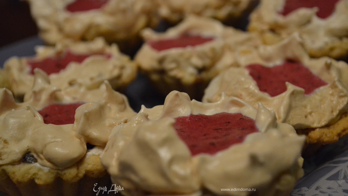 Положить по краям слой безе (чтобы смородина не стекала с тарталеток). Для этого можно использовать кулинарный шприц или просто чайную ложку. В середину тарталетки выложить ложечкой ягодную массу. Поместить в духовку на 10-15 минут. Вынимать, когда безе станет нежно-бежевого цвета. Приятного аппетита!
