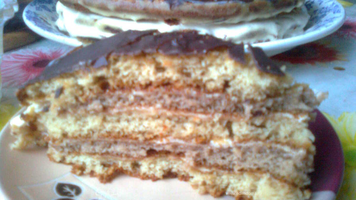 - Шаг 1Соду погасить в меду.Взбить сахар и яйца , добавить мед , муку. Испечь 5-6 коржей. Готовые коржи промазать кремом ( взбить сметану с сахаром и лимонным соком ). Верхний корж полить шоколадной глазурью ( шоколад растопить , добавить слив.масло и сливки ).