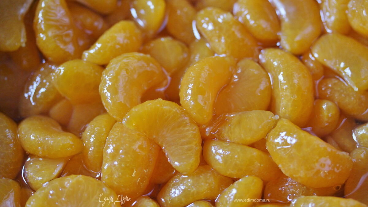 - Шаг 1Очистите мандарины, разделите на дольки, засыпьте сахаром в эмалированной посуде, перемешайте, оставьте на ночь,чтобы мандарины дали сок.