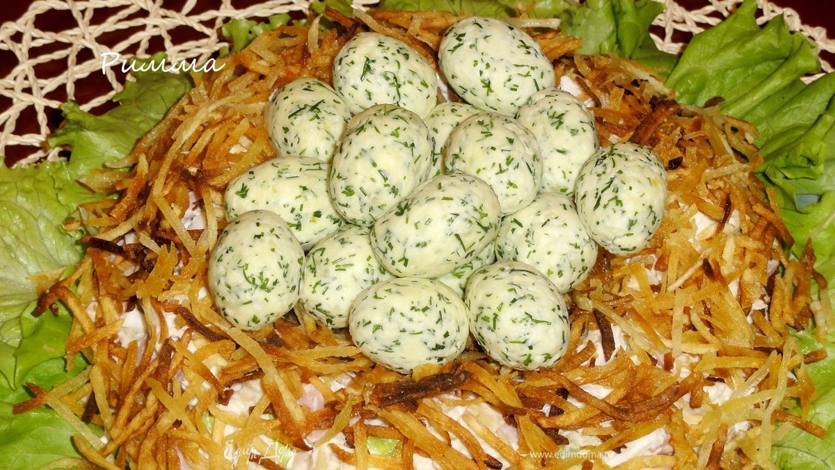 Этот салат любит готовить моя старшая дочь. Вкус очень нежный, с хрустящим картофелем и остренькими «яйцами» с чесноком и сыром.