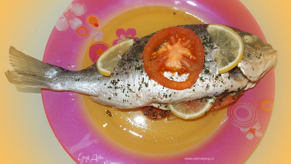 - Шаг 4Брюшко сбрызгиваем соком лимона, посыпаем укропом, кладем кружок помидора, лимона и опять посыпаем укропом и немного специями.