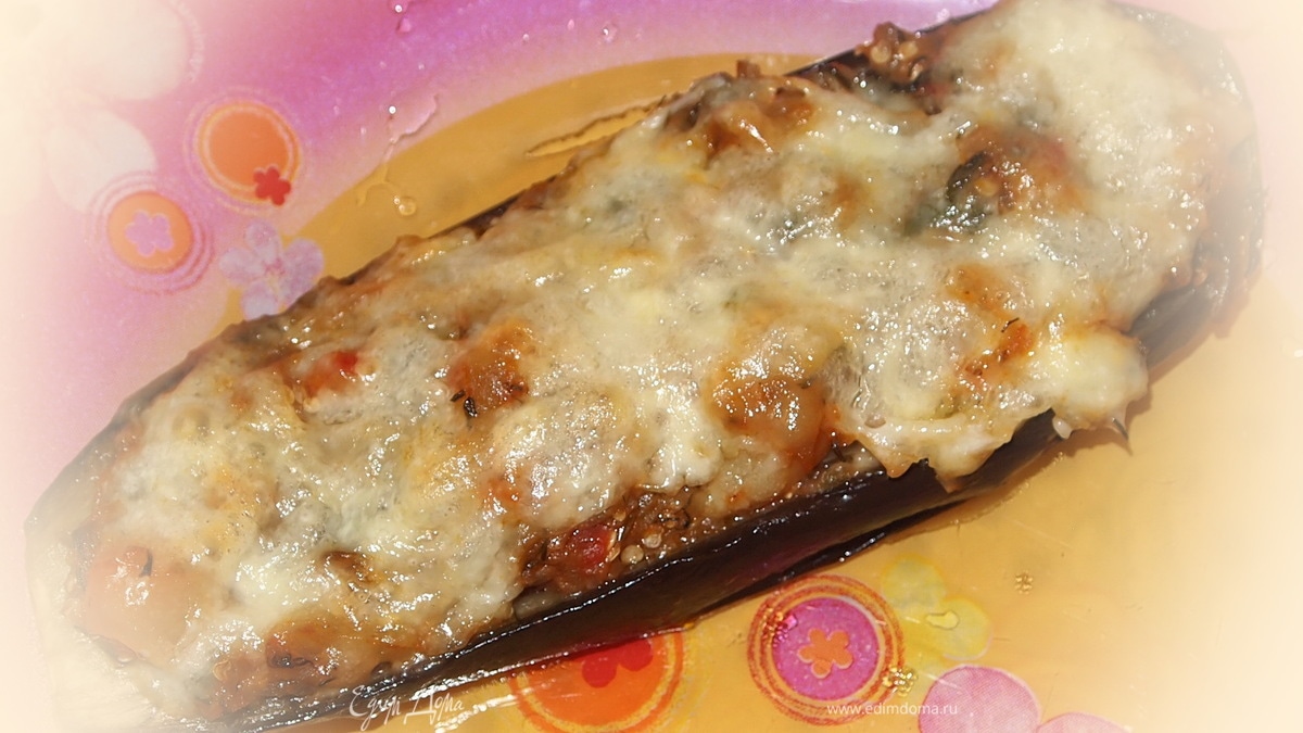 - Шаг 9Приготовленным фаршем. наполняем баклажановые лодочки, посыпать тёртым сыром (тереть на крупной тёрке) и запечь 10 мин. при t-180гр. Запекать до золотистой сырной корочки.