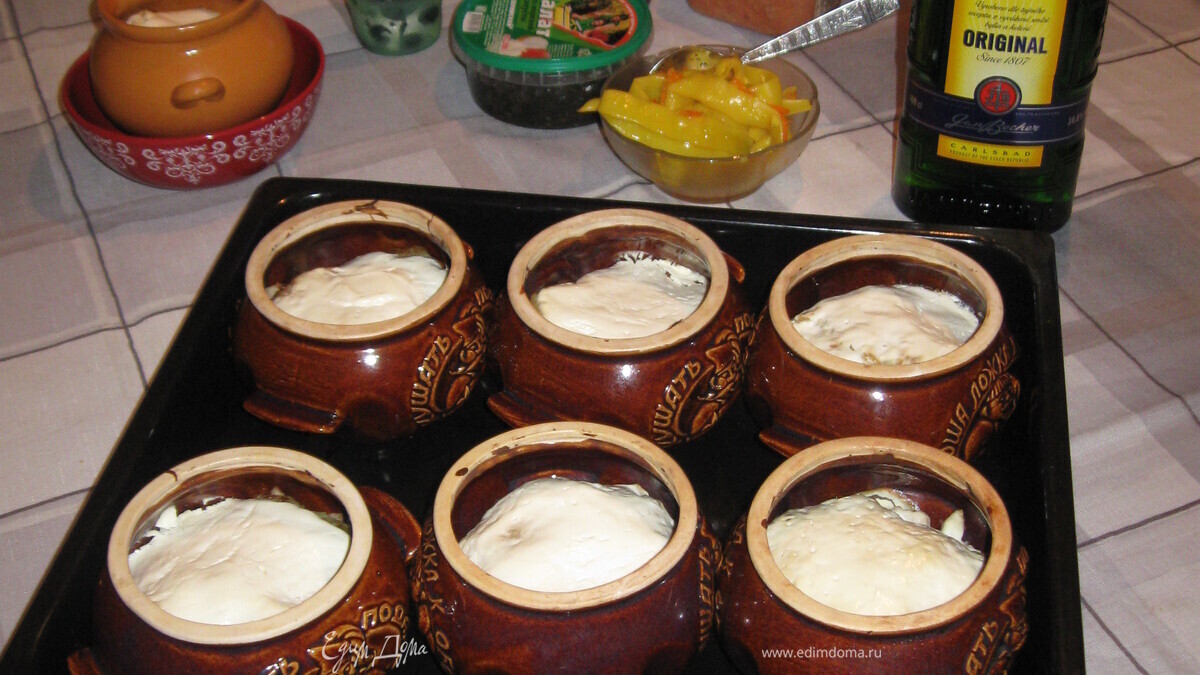 Закрываем горшочки крышками и ставим в разогретую до t 200гр. духовку и запекаем до готовности. Определяем по сметане.....(запеклась) Снимаем крышки и оставляем еще на 10-15 мин.