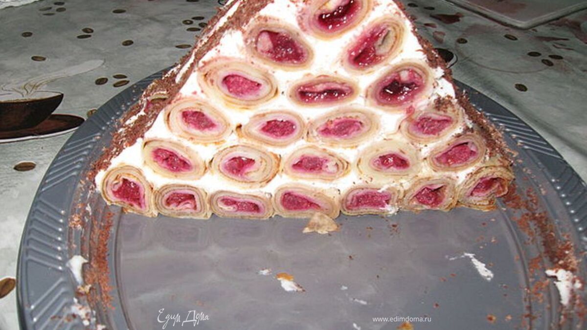 - Шаг 1Испечь блины по вашему рецепту. Затем на каждый блин на край выкладывать по 7-8 вишенек(у меня вишня консервированная) и свернуть трубочкой и складывать трубочки на блюдо горкой ,уменьшая кол-во трубочек с каждым рядом,чтобы последний ряд была 1 трубочка,все слои обильно промазывать кремом. Крем: сливки взбить с сахаром. Крем можно приготовить и со сметаной,результат будет не хуже.Сверху готовый торт посыпать тертым шоколадом.Оставить пропитываться в холодильнике не менее 5-6 часов.Приятного чаепития!