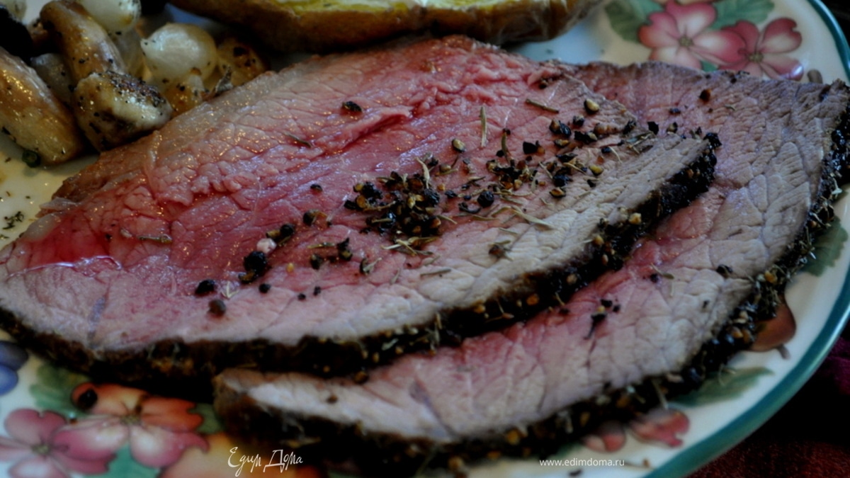 Достать ростбиф из духовки, прикрыть фольгой и дать постоять 10-15мин. Разрезать по порциям и подавать с любимым гарниром.