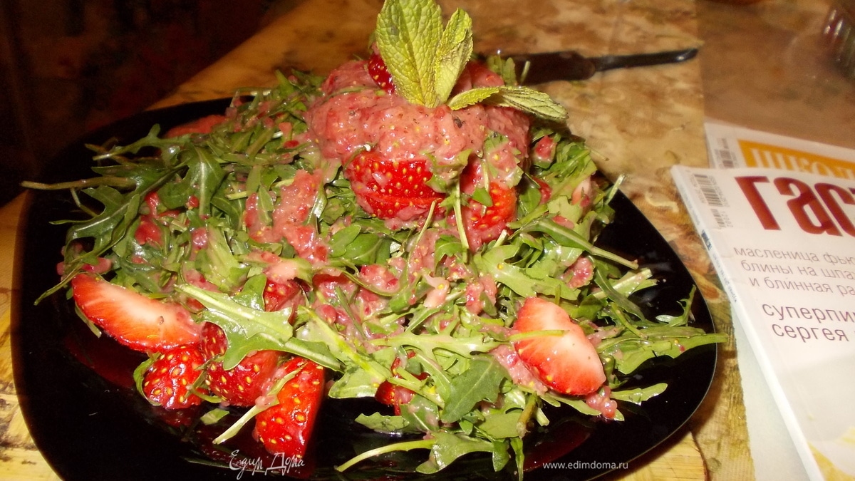 ПОЛОВИНУ ЯГОД ВЗБИТЬ В БЛЕНДЕРЕ С УКСУСОМ,МАСЛОМ И ГОРЧИЦЕЙ,СОЛЬ ПЕРЕЦ ПО ВКУСУ.РУККОЛУ КРУПНО НАРВАТЬ,КЛУБНИКУ ТОНКО НАРЕЗАТЬ.ЗАПРАВИТЬ СОУСОМ.ПРИЯТНОГО АППЕТИТА!!!