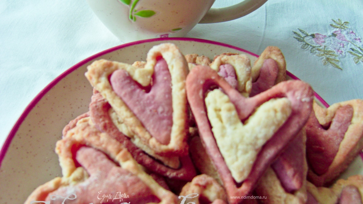 Смешать растопленное сливочное масло, яйца, сахар, ванильный сахар. Полученную массу разделить на две части. В одну из них добавить вишневый сок. - Шаг 3Замесить тесто. Раскатать каждое тесто и выемкой для печенья вырезать сердечки (большое и в середине маленькое). Выложить на противень, выстеленный бумагой для запекания.