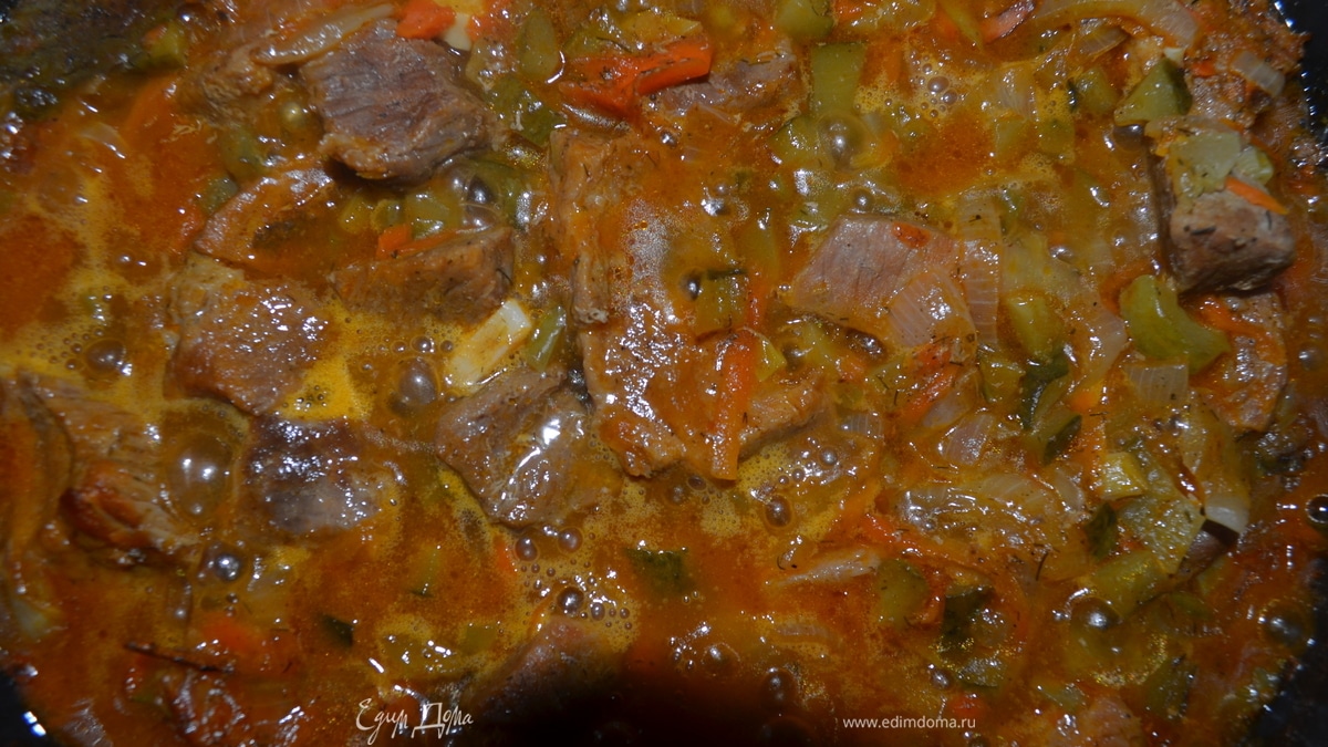 Приготовление: Обжарить на оливковом масле мясо и тушить в небольшом количестве жидкости на маленьком огне до полной мягкости ( около 1,5 часов). Выпарить жидкость. Долить немного масла положить нарезанный полукольцами лук, крупно натертую морковь, мелко порубленный чеснок и все обжарить, налить немного воды, прокипятить, добавить нарезанные кубиками огурцы, томатную пасту, соль, специи и зелень, при необходимости добавить воды, прокипятить. В качестве гарнира можно падать перловую или пшенную кашу ( способ приготовления на упаковке), картофельное пюре. МИР ВАМ.