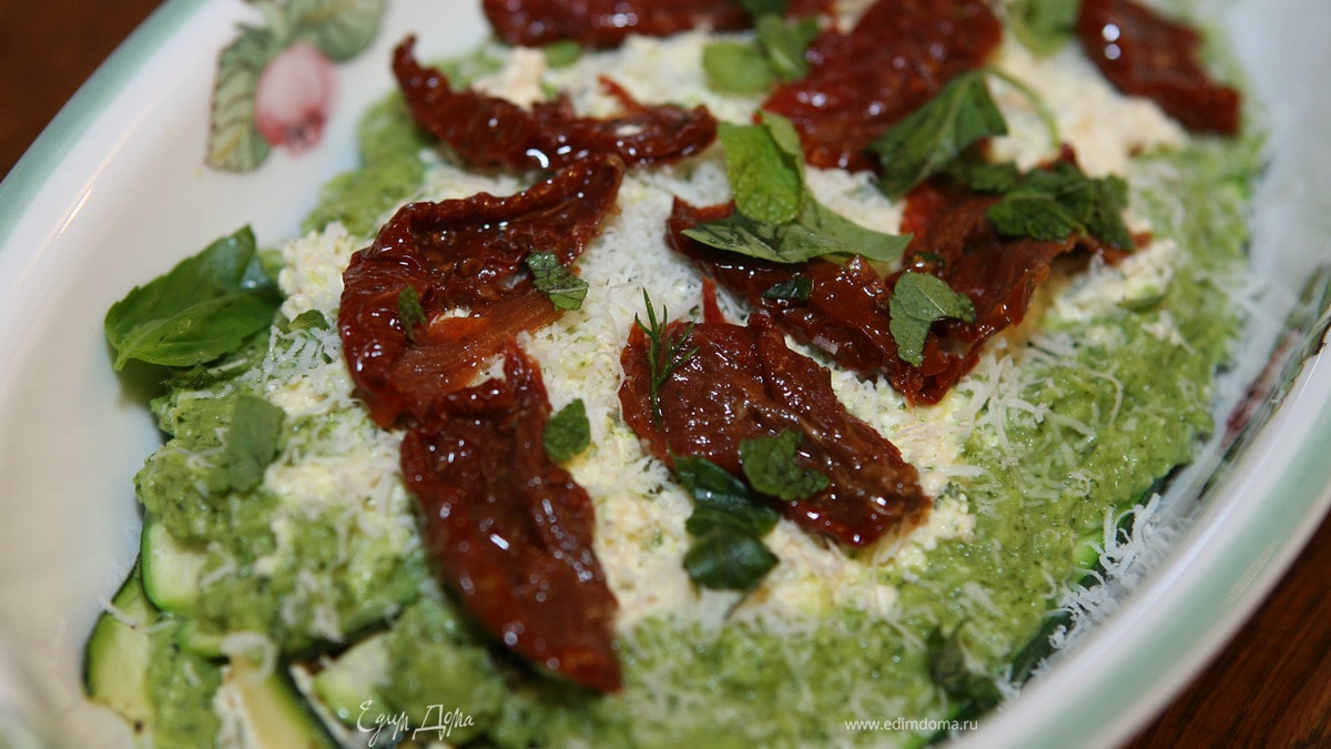 Выложить в глубокое блюдо слоями запеченные полоски цукини, соус песто, рикотту, слегка присыпать пармезаном, сверху разложить помидоры, снова слоями цукини, рикотту, песто, присыпать оставшимся пармезаном, выложить слой помидоров и присыпать листьями базилика.