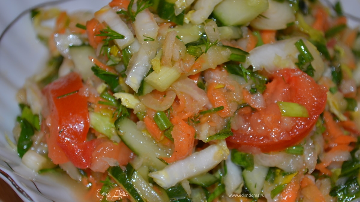 Приготовление: Салат порезать и немного помять с солью, помидоры и огурцы порезать ломтиками, перец порезать соломкой, лук кольцами, яблоко, морковь, редис натереть на крупной терке, всю зелень мелко порезать, чеснок порубить. Зелень и овощи сложить в салатник посолить и поперчить. Перемешать. Сок лимона, уксус и оливковое масло тщательно смешать, и залить салат. МИР ВАМ.