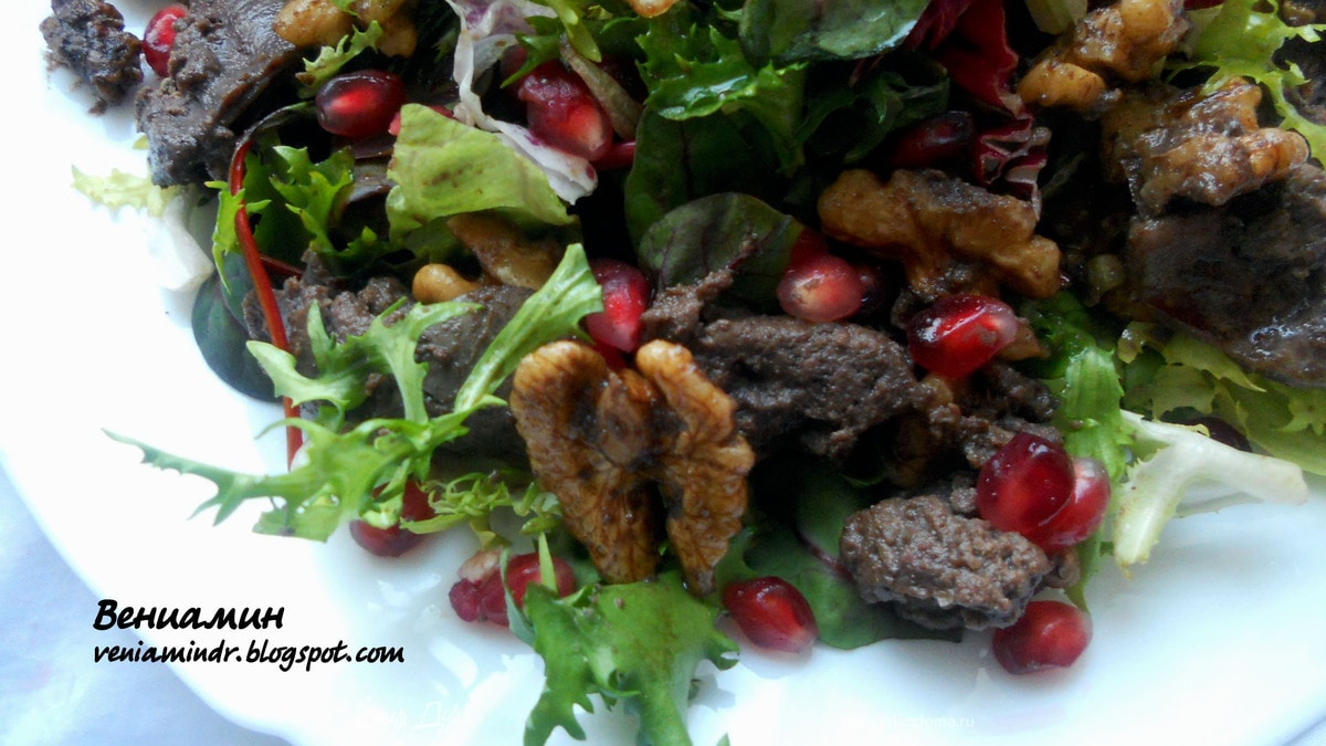 Соединить салат и зерна граната, слегка сбрызнуть оливковым маслом. При подаче поверх салата выложить теплую печень, можно также использовать немного масла (и коньяка), в котором жарилась печень. Душевно! Коньяк особо не чувствуется, просто приятное послевкусие и легкий аромат:)