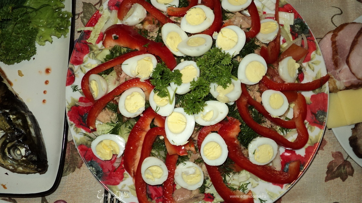 - Шаг 1Выкладываем слоями. На низ пекинская капуста, побрызгать бальзамическим соусом, 1 помидор, 1 огурец, тунец 2 баночки, зелень, 1 перец и перепелинные яица. В конце поливаем оливкомым маслом.