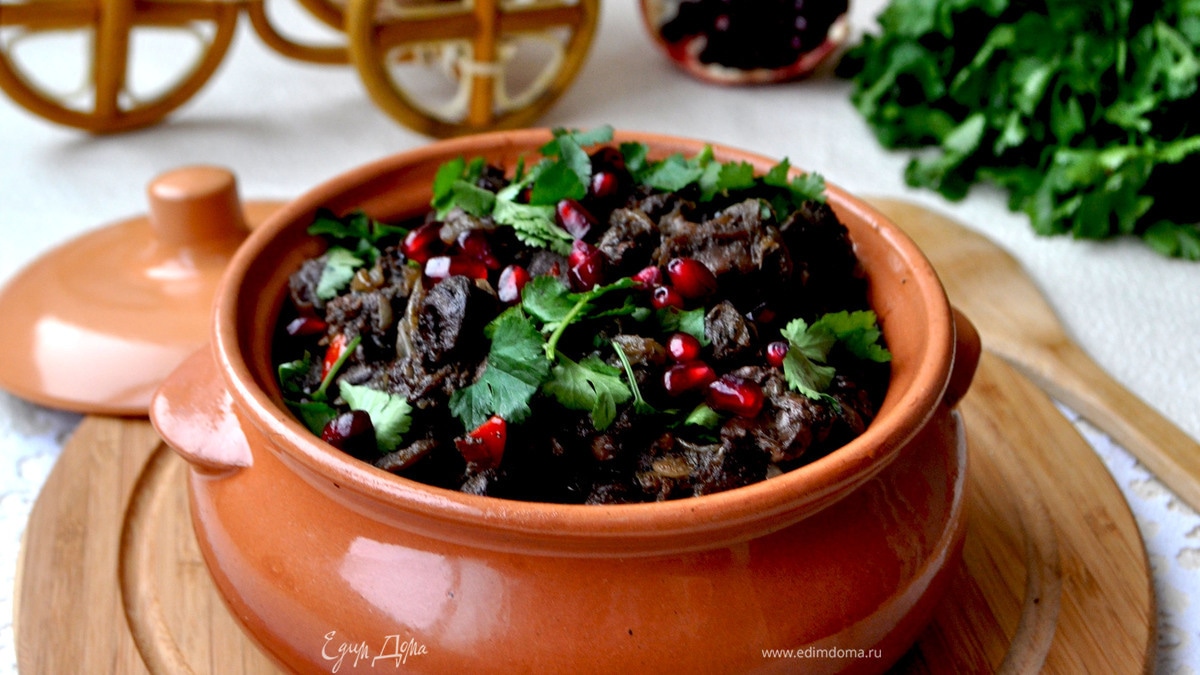 - Шаг 1Гранат заранее положить в холодильник. Потрошки промыть и нарезать небольшими кусочками. Лук очистить, нашинковать. В сковороде разогреть 2 ст. л. растительного масла. Положить потрошки, приправить солью и черным перцем, обжарить на сильном огне, 6-7 мин. Добавить 3 ст. л. вина ,ушить на медленном огне 30 мин., пока жидкость полностью не выпарится.