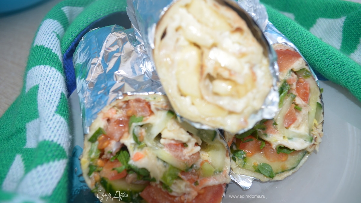 - Шаг 2Лаваш намазать плавленым сыром , на него положить измельченную пекинскую капусту заправленную натуральным йогуртом, морской солью, перцам черным молотым. Сверху кружочки огурцов, помидор, измельченное мясо ,зелень. Туго свернуть в рулет и завернуть в фольгу.