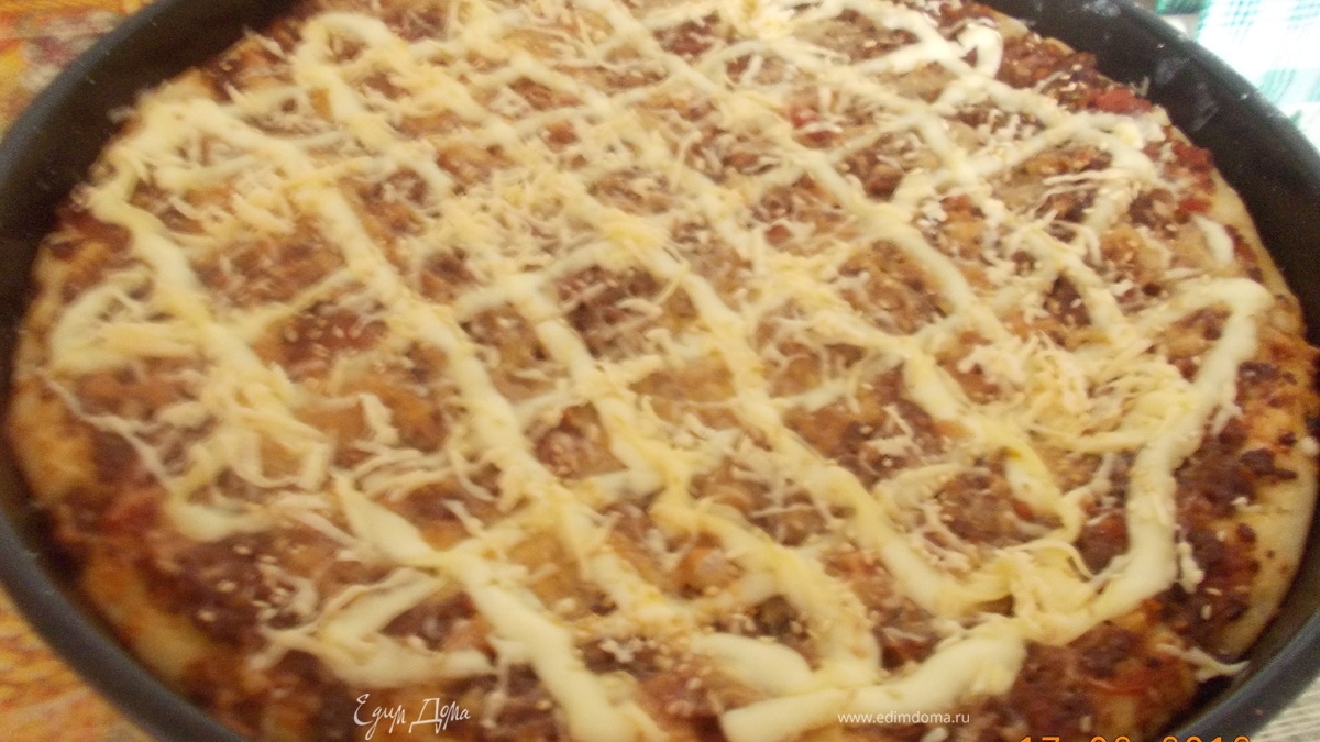 Первый раз пекла такую пиццу,всем очень понравилась.Дело в том что у нас в семье все очень любят мясо.Вот я и решила сделать именно мясную.Соус получился почти как "болоньезе",только без сельдерея.Тесто мягкое...в общем съели за считанные минуты.А вообще судить вам!!!