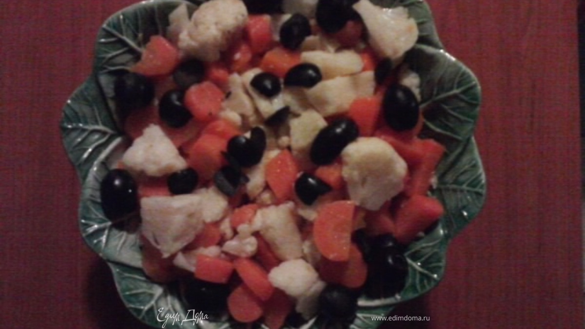 - Шаг 1Отварить по отдельности овощи,дать им остыть, потом цветную капусту порезать на небольшие кусочки,а морковь-кружочками. Взять небольшую емкость,выложить овощи и аккуратно их смешать вместе с оливками. Выжать сок лимонов,посолить и добавить по вкусу оливкового масла и снова перемешать салат,выложить сверху кусочки тунца. Потом на некоторое время поставить его в холодильник.ПРИЯТНОГО АППЕТИТА!