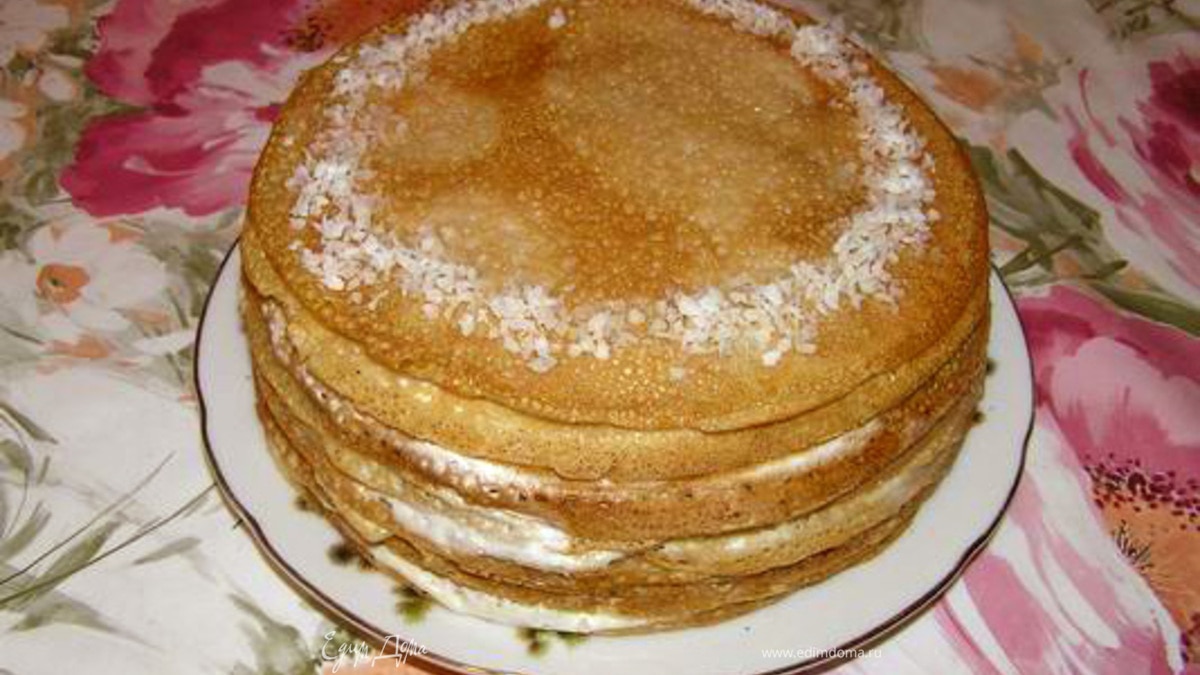 А это мой первый блинный торт, сделанный 2 года назад. Состав: блинчики по этому рецепту + крем из сгущеного молока и сметаны в равных пропорциях. Украшение - кокосовая стружка. Делается легко и просто, хотя тогда я так не думала ;))