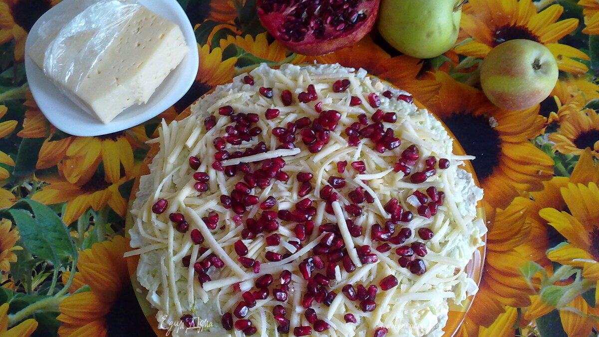 - Шаг 3Яблоки очистить, натереть на крупной терке и сразу же перемешать с 2 ст. ложками запрвки. Распределить поверх яиц, посыпать тертым сыром. Украсить зернами граната и отправить в холодильник на 3-4 часа. Приятного всем аппетита!!!!