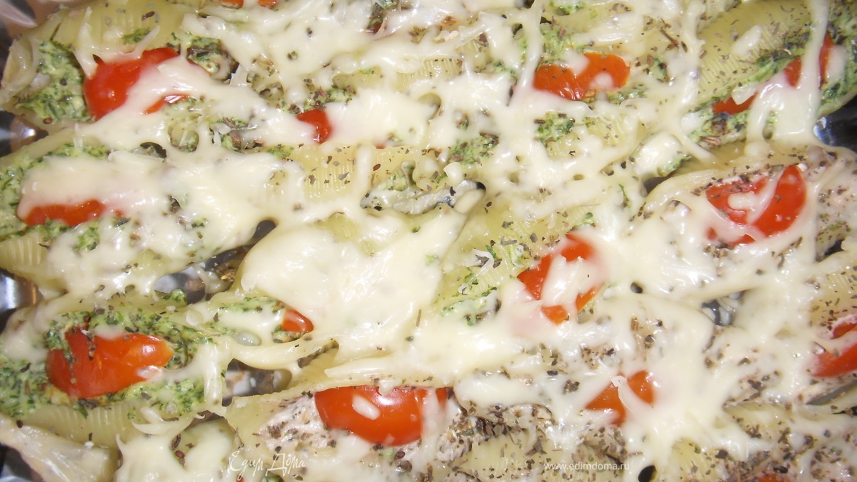 - Шаг 3Наполнить пасту начинку, в каждую ракушку класть по нарезанной помидорке. Выложить в форму, присыпать пармезаном, печь в духовке на 200 градусов около 30мин.