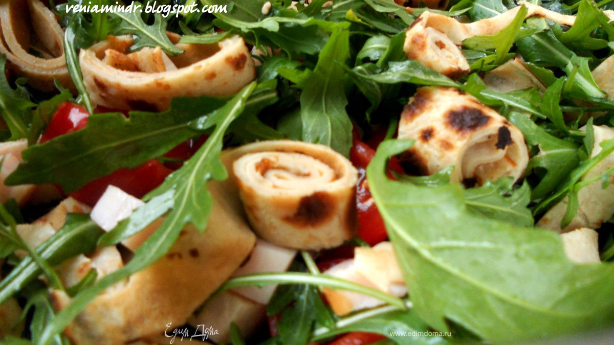 Салат с руколой, копченой куриной грудкой и ржаными блинчиками