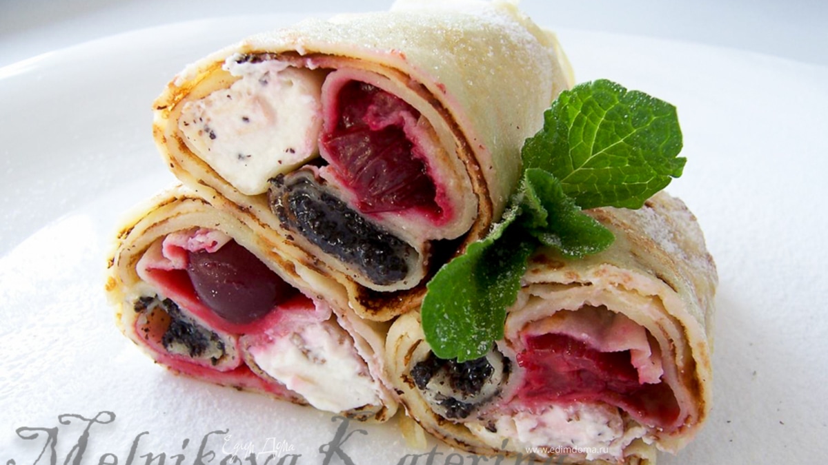 Честно признаюсь, идею блинчиков с тремя начинками взята из старого журнала "Вкусно и просто". Делаю такие блинчики впервые, интересно было попробовать... Сами блинчики пекла по своему проверенному рецепту, чтобы они были максимально тонкими, да и начинки немного видоизменила. Изначально сомневалась, делать яблоки с корицей или вишню. Остановилась на вишне, но с яблоками думаю тоже будет неплохо. В результате получился целый десерт к Масленице, который очень вкусный, начинки подходят друг к другу как нельзя лучше: сочная с кислинкой вишня, ванильный творог и ароматный мак! Угощайтесь!