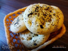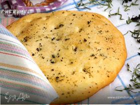 - Шаг 5Выложить лепешку на противень с пергаментной бумагой, руками растянуть лепешку, увеличив тем самым ее диаметр, но сохраняя круглую форму. Если нужно, добавить по поверхности еще травок. Сверху еще раз смазать оливковым маслом, притрусить солью, дать тесту отдохнуть пару минут и отправить в разогретую до 180 градусов духовку минут на 20-30. Пару минут подержать хлебушек в духовке, а затем выложить на решетку, накрыть бумажным полотенцем и оставить, пока не остынет (даже если подавать сразу после выпекания, все равно минут 20 хлебушек должен отдохнуть после выпекания). При подаче советую разогреть в течение 30 сек. на максим. мощности микроволновки. Приятного аппетита!!!