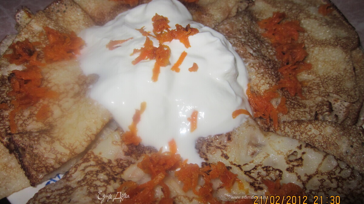 Захотела попробовать испечь блинчики с припеком.Муж любит морковную начинку...в пирожках...Решила соединить полезное (масленница же!) с приятным (мужу подсластить!) и получились обалденные блинчики!