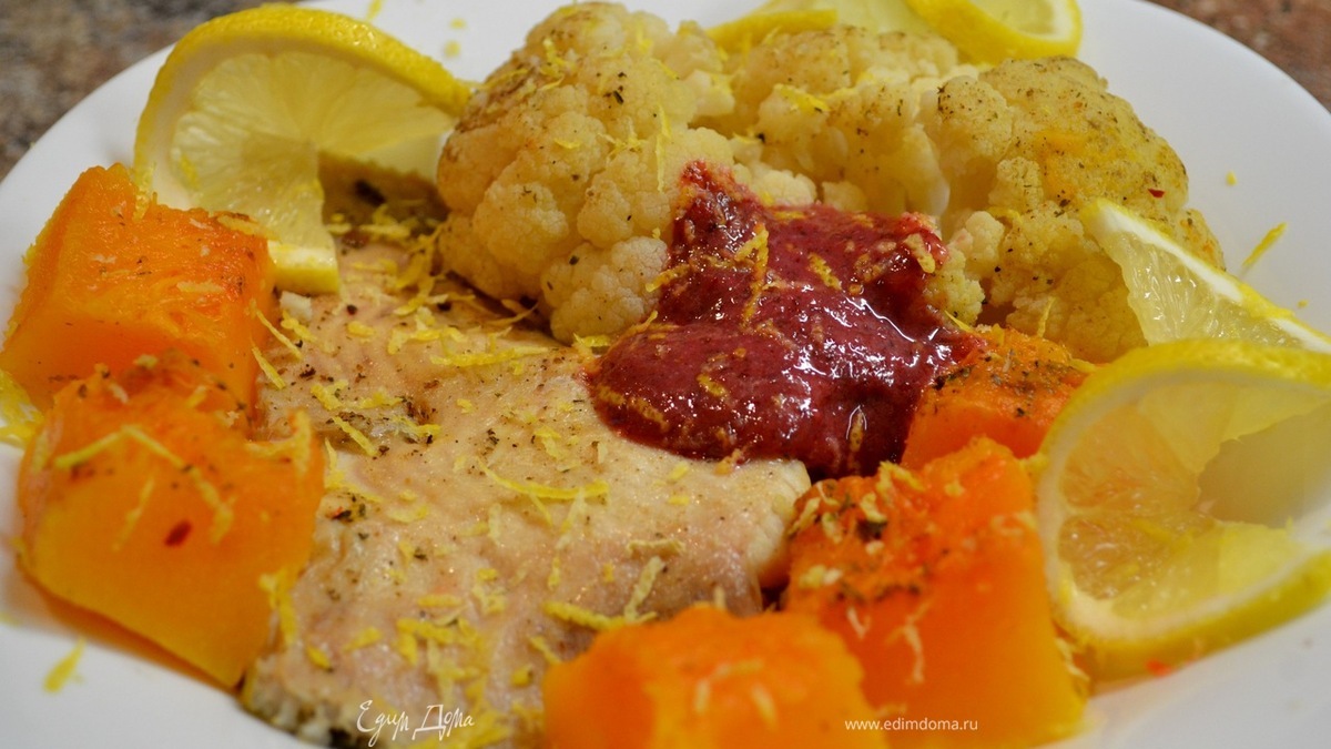 Отвариваю на пару камбалу,тыкву,цветную капусту.Посыпать солью и специями...Подать с лимоном и соусом из брусники.