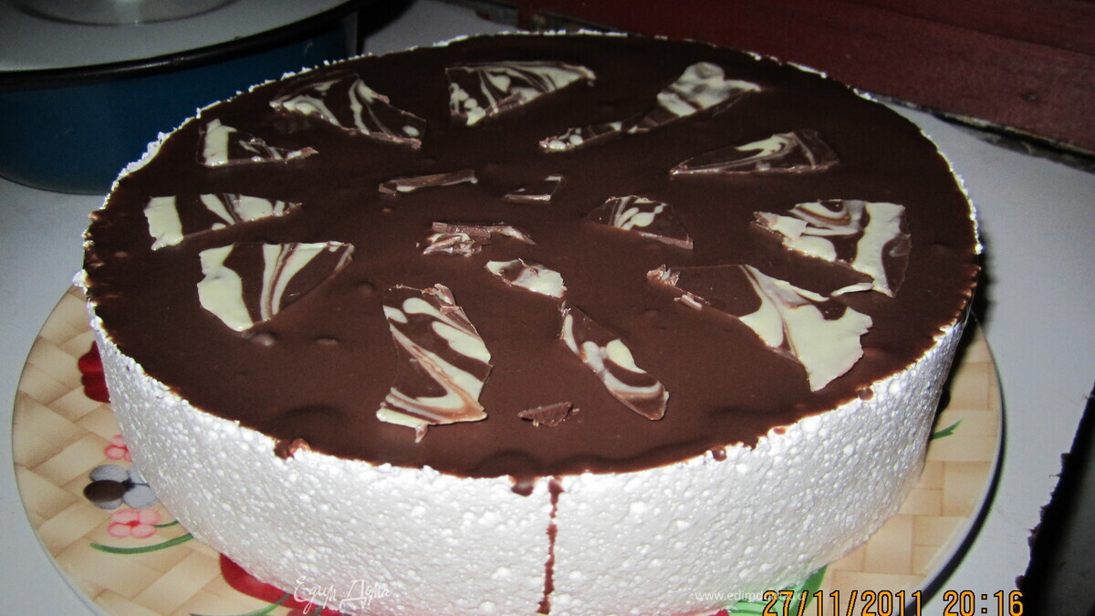 - Шаг 4Теперь в форму с бортиками положить один корж, сверху половина суфле вылить, снова корж и остальное суфле. Поставить на холод застыть. Сверху полить шоколадом или глазурью.