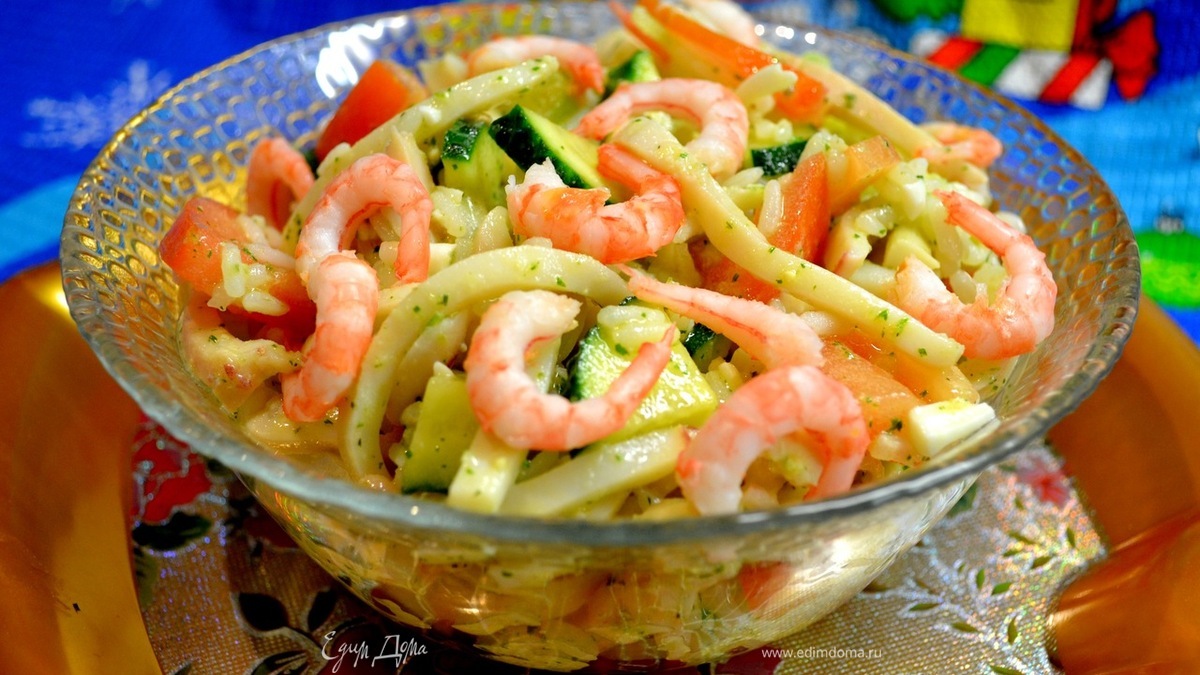 Кальмар 500гр-отвариваем 3-5мин.режем соломкой креветки 350гр. помидоры 3шт огурцы 2шт. яйца 2шт. стебли сельдерея 2ш-мелко покрошить рис 400гр.отварного. Ингредиенты на салат нарезаем,перемешать и заправить соусом. - Шаг 2