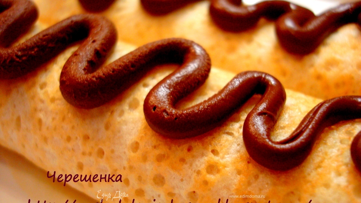Украсить вы можете на свое усмотрение. У меня, честно говоря, время было ограничено, поэтому я быстренько положила шоколад в СВЧ на полную мощность на 2 минуты, затем выложила его в обыкновенный пакетик, сделала в нем зубочисткой дырочку и выдавила на блинчики… Вот такая прелесть получилась…