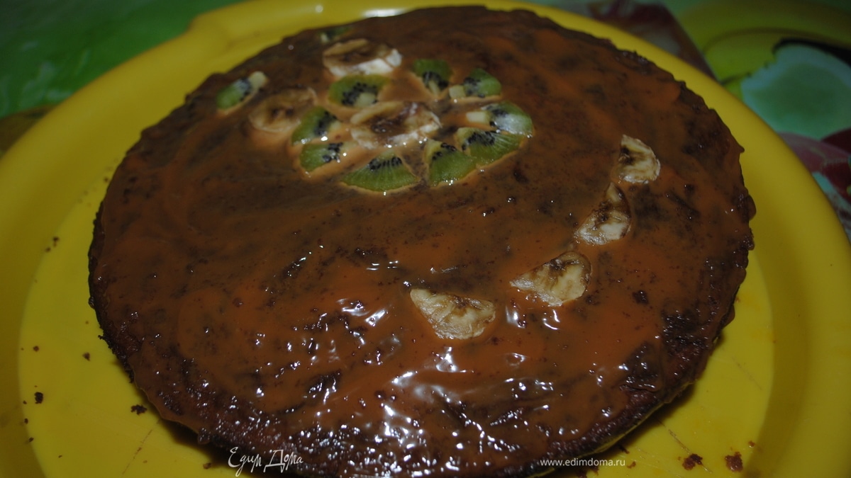 Сливочное масло и кусочки шоколада растопить в микроволновой печи в течении 2 минут.100г сахара взбить с 3 яйцами, добавить муку, разрыхлитель, коньяк и растопленные шоколад и масло.Хорошо вымешать тесто.Выпекать в микроволновой печи в термостойкой посуде в течении 7 минут(или в обычной духовке). Пока бисквит печется делаем крем-1 яйцо взбиваем с сахарной пудрой, вымешиваем с мягким сливочным маслом и добавляем или ваниль, или растопленный шоколад, в зависимости от того,какой крем мы хотим приготовить. Бисквиту даем остыть,разрезаем его поперек на 4-5 частей, смазываем кремом,укладываем фрукты и обсыпаем шоколадной крошкой. Приятного аппетита!