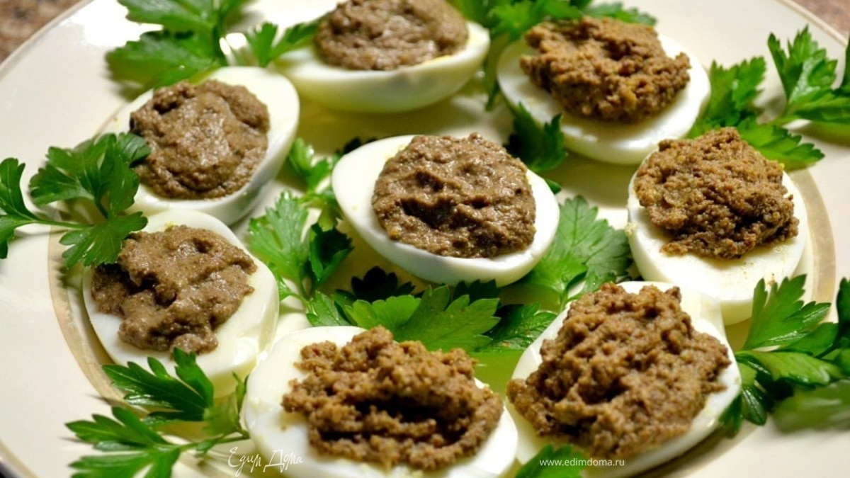 а)Первую часть перемалываю блендером добавляю слив.масло + 4 желтка,а белки наполним готовым паштетом. - Шаг 4