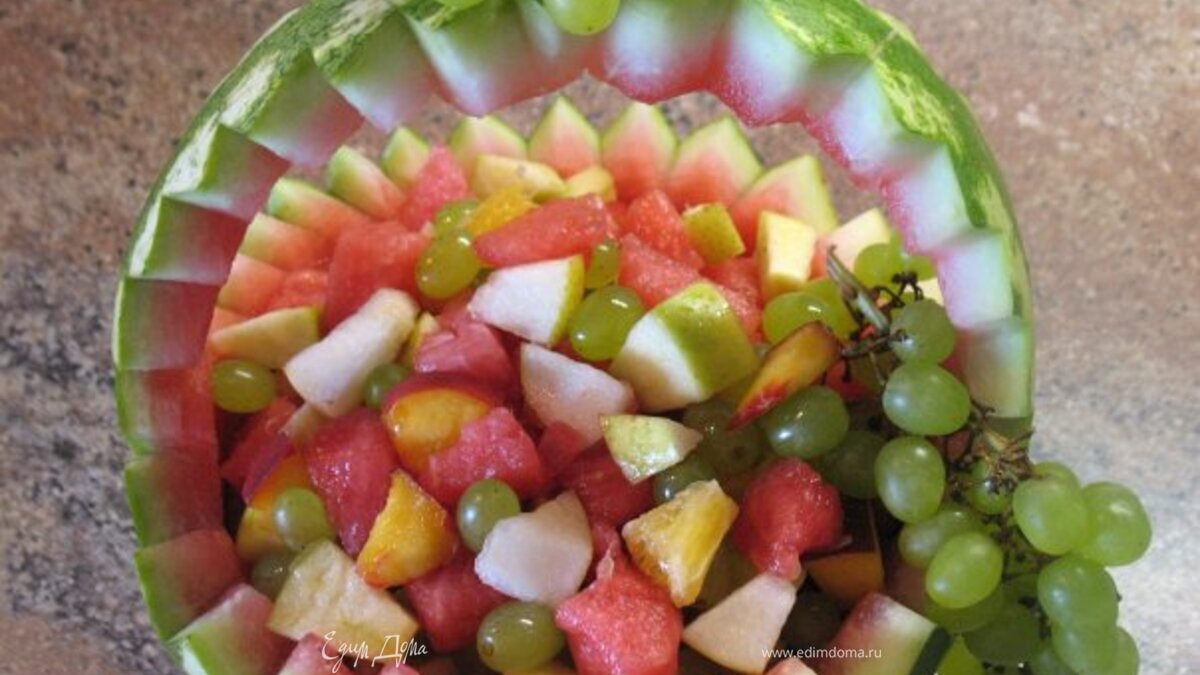 Корзинку из арбуза наполняем порезанными на кубки: арбуз,персик,яблоко ,груша,апельсин,виноград. Всё поливаем чуть мёдом и перемешиваем!!!) - Шаг 2
