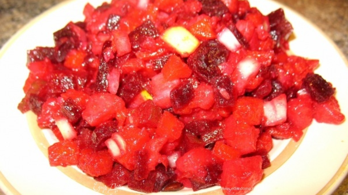 Резать все ингредиенты можно в одну емкость сразу. Чтобы продукты не окрашивались и не теряли свой цвет, тогда нарезать лучше в разные тары. Свеклу отдельно от остальных продуктов заправить маслом и затем объединить с остальными ингредиентами. - Шаг 1