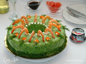 круглую форму смазываем маслом, на дно кладём 1 блин, ешё 8 блинов выкладываем в форме цветка, так, чтобы "лепестки" свисали - Шаг 7