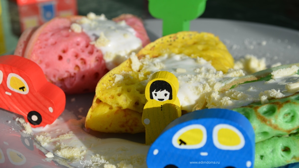 Приготовление: В кастрюлю вливаем воду и разводим в ней дрожжи, всыпаем 500 грамм муки, хорошо вымешиваем . Ставим на 1 час в теплое место. Когда подойдет опара добавляем соль ,сахар, теплое оливковое масло. Снова вымешиваем тесто и постепенно всыпаем остальную муку, вымешиваем до гладкости. Затем густое тесто делим на 3 части. Пищевые красители разводим теплым молоком, вливаем их постепенно в тесто и тщательно размешиваем. Ставим в теплое место , чтобы поднялось. Снова размешиваем и опять даем подняться. Взбитые в пену яичные белки добавляем в каждую емкость. Начинаем печь блины, как только тесто поднимется. МИР ВАМ!