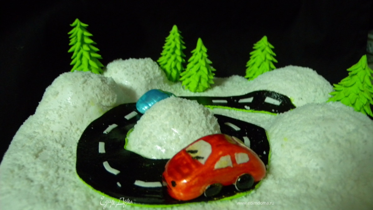 Делала торт ровно месяц назад для празднования дня рождения своего крестника Максика. В торте много молочных продуктов — 7 видов. Молоко, йогурт, сметана, масло, творог, сгущенное молоко, вареное сгущенное молоко и ириски. Начинку можно было сделать по цвету более контрастной, но я не хотела перегружать. Также не хотела использовать краситель. Но в декоре все же его использовала. Но, так сказать, по минимуму. Черную дорогу мы потом выбросили, хотя краситель и был пищевой. Елочки съели взрослые. Вообще, по вкусу всем очень понравился. Попробуйте и вы.