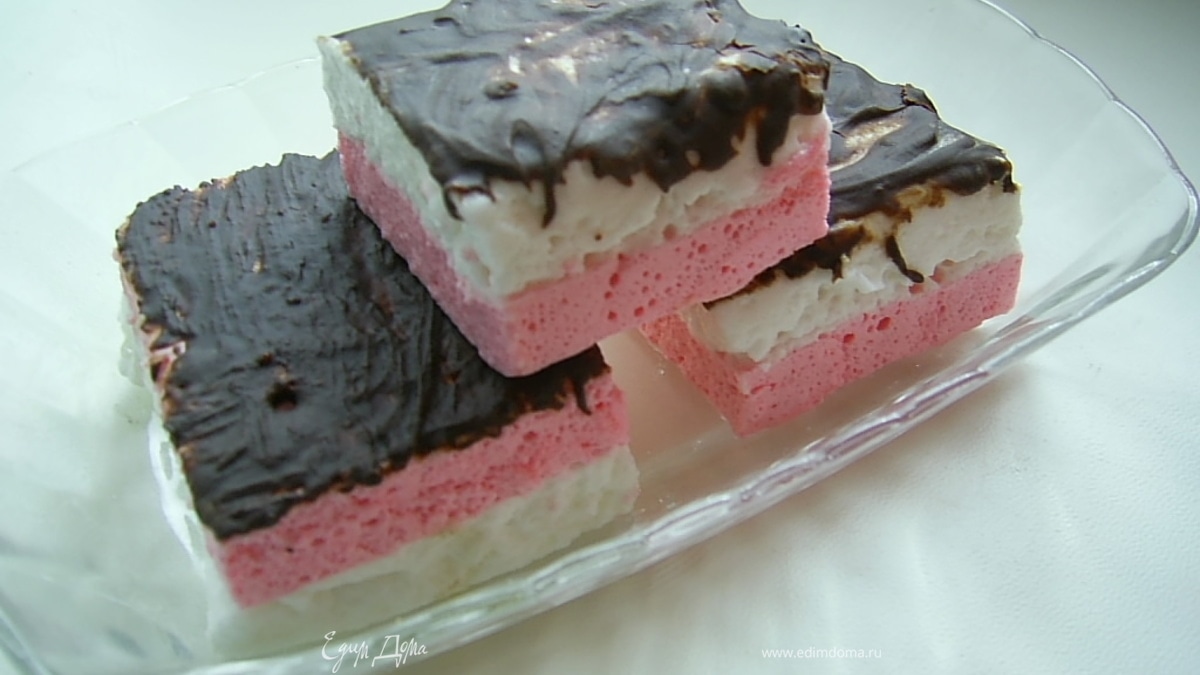 .Желатин залить водой,дать набухнуть.Можно делать двухцветное,так ка я тогда брать 3 белка взбить до пышной пены,добавить 1 стак.сах.пудры,опять взбить.Растопить желатин,когда остынет вылить половину в белковую масу.Залить в силиконовую форму,дать застыть.Повторить все так же с оставшимися продуктами,только добавить краситель пищевой.Залить сверху.Когда птичье молоко застынет порезать на порционные кубики и смазать растопленным шоколадом .Поставить в холодильник.