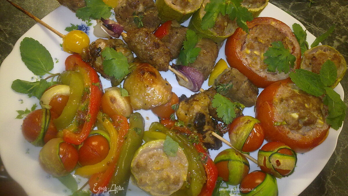 Это ассорти из шашлыка и фаршированных овощей. Делается на мангале или гриле. Я делала в духовке. Все делала параллельно, так что, не смотря на нудное описание, довольно быстро. Ну а вкуснооо)))