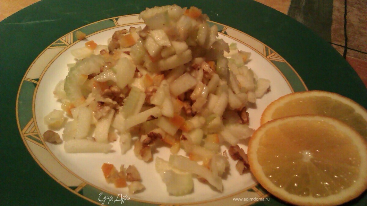 Палочки сельдерея помыть, просушить, порезать тонко и не очень крупно. Очистить с яблок кожу, порезать тонкой соломкой. Орешки порубить. Всё смешать. Заправит соком апельсина и лимона. - Шаг 3