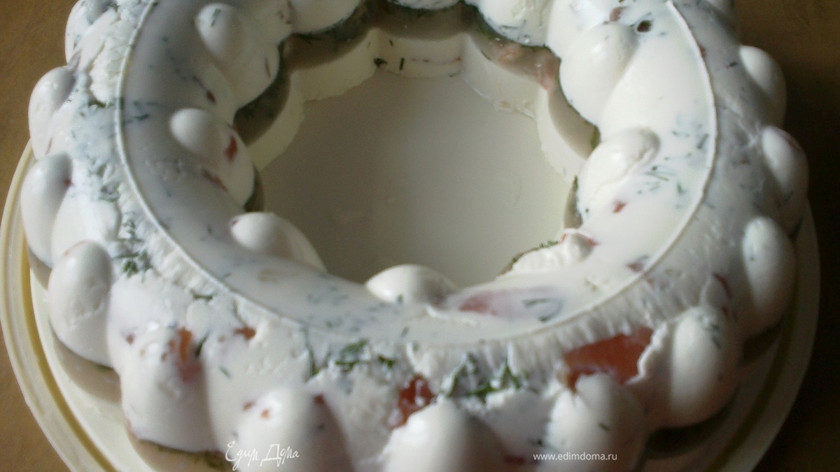 Я пользуюсь желейной формой диаметром около 23 см. Но вполне можно обойтись и без нее))) - Шаг 2Половину, порезанного кусочками, лосося выложить на дно формы, посыпать укропом.
