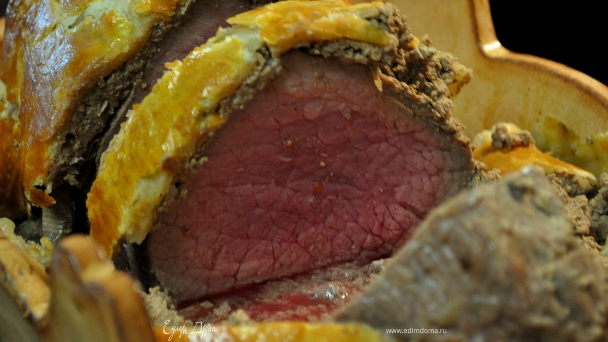 Разогреть духовку до 210-220гр. Достать говядину из хол-ка смазать яйцом,проколоть местами тесто, поставить в духовку, готовить около часа,мясо внутри должно быть розовым.В течение готовки можно прикрыть фольгой, чтоб тесто не сгорело.Перед подачей дать ему постоять 10мин и разрезать на порцион.куски осторожно.Подавать с любимым гарниром.